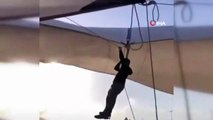 Kadıköy'de pazar çadırı kurduğu sırada eli ipe takılan pazarcı Mehmet Pekcan, rüzgarın şiddetiyle havalanan çadırla beraber metrelerce havaya yükseldi.