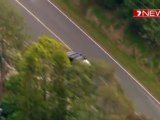 Police are holding guns trying to stop the driver from fleeing but are continuously ignored. The driver almost runs over one of the policemen.
