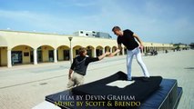 This guy was jumping on teeterboard with another guy on the opposite side. After a few normal jumps, he flipped in the air but couldn't land properly. First, he fell on his stomach on the padded mats simultaneously hit his neck on the board. Then he lied flat on the floor grunting in pain.