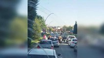 Beykoz'da sinyal verip yola çıkan otomobil neredeyse kaza yapıyordu. Maganda trafikte sinyal veren aracın önünü kesti. Ellerini beline bağlayan maganda ile tartışan sürücü, sinyal verdiğini söylerken o anlar araç içi kamerasına yansıdı. (İHA)