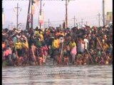 Pilgrims at the Triveni Sangam, the confluence of the Ganges and the Yamuna rivers in Allahabad.