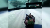 - Sivas'ın Zara ilçesinde traktörün ve eşeğin arkasına bağlanan kızaklarla karda kayan çocuklar karın tadını çıkarttı. Geçtiğimiz günlerde etkili olan Yoğun kar yağışının ardından kar Zara ilçesi Adamfakı köyünde kalınlığı yarım metreye kadar ulaştı. Köy muhtarı Avni Yüksel, traktörünün arkasına bağladığı kızakla çocuklara kar keyfi yaşattı. Köy yolunda traktör arkasında kızak üzerinde karda kayan çocuklar, daha sonra bir eşeğin arkasına bağlanan kızakla da köy içinde karda kaydılar. Kar tatilini eğlenceye dönüştürdüklerini belirten Avni Yüksel, “Kar tatili uzun olunca çocuklara bir eğlence düşündük. İlk önce kızağı eşeğin arkasına bağlayarak sırayla çocukları kaydırmaya çalıştım. Çocukların biri kayıyor, biri peşine koşuyor. Daha sonra tahta ve saçtan bir kızak sistemi yaptık. Yaptığımız kızağı traktörün arkasına bağlayarak, çocukların tamamını bindirerek karlı yolda kızakla kaydırarak kar tatilinde çocuklara güzel anlar yaşatmak için elimizden geleni yapmaya çalıştık” dedi.