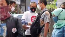 Penyandang disabilitas dari Perhimpunan Penyandang Disabilitas Indonesia membagikan masker gratis kepada pengendara yang tidak memakai masker di kawasan Cikapayang.