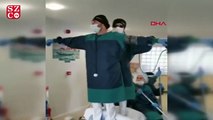 Antalya'da özel bir diyaliz merkezi çalışanları, koronavirüs salgını stresinden bunalınca, hasta yatağını gemi, paspasları kürek gibi kullanıp, Leonardo Di Caprio ve Kate Winslet'in gemi önündeki efsane pozunun verildiği o anı canlandırdı. (DHA)
