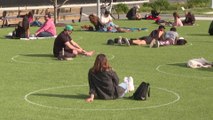 Des New-Yorkais profitent des activités en plein air en se tenant à distance dans des cercles tracés sur la pelouse du Domino Park à Brooklyn.