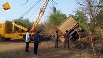 A crane attempting to pull out a car from a river in Durg, central India plummeted into the water after buckling under the weight.