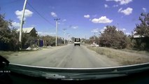 This is the heart-stopping moment a cyclist narrowly avoided being crushed by an overtaking truck.
