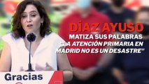 Ayuso matiza sus palabras y dice que la atención primaria en Madrid "no es un desastre"