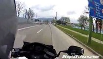 The bus driver slams brakes and comes to a halt. But the biker continues towards the larger vehicle and then at the last moment swerves to his right averting a horrendous crash.