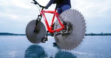 Ce vélo monté sur des lames de scie circulaire est capable de rouler sur une surface gelée