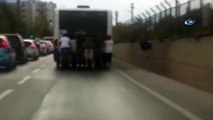 Antalya'da bir grup patenli genç, karayolunda tren şeklinde yokuş aşağı inerek hem hayatlarını hem de araç trafiğini tehlikeye soktu. Antalyalı patenli gençlerin ölümüne yolculuğu cep telefonu kamerasına anbean yansıdı.
