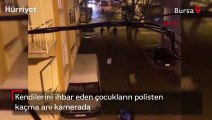 Bursa'da, sokağa çıkma kısıtlamasını ihlal edip kendilerini ihbar eden çocukların ekip otosuyla gelen polislerden kaçtığı anlar, cep telefonu kamerasına yansıdı. Polisten kaçan çocukların bunu oyun haline getirdiği öğrenildi.