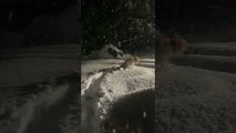 This dog jumped through a big mound of snow by the front door of their house when their pet-parent asked them if they wanted to potty outside. The dog seemed very excited to go outside in the snow and hopped into the woods like a bunny.