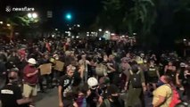 Meanwhile, in Portland -- Face off between protesters and federal agents in Portland, as the agents cordoned off the vehicle entrance to the facility while the ambulance loaded up. Another arrest made here in Portland as federal agents handcuff a man outside the I.C.E. facility. Teargas on the streets of Portland as protesters face off with federal agents outside the I.C.E. facility tonight.