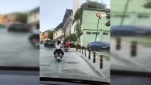- Kadıköy’de bir motosiklet sürücüsü yaklaşık 2 metre uzunluğundaki tekerlekli raf standını arkadaşı yardımıyla motor hareket halindeyken taşıdı. Yaşanan o anlar ise çevredeki bir araç sürücüsünün cep telefonu kamerasına yansıdı. Olay, sokağa çıkma kısıtlamasının uygulandığı Pazar günü Kadıköy Recep Peker Caddesi üzerinde meydana geldi. Bir motosiklet üzerinde seyir halinde olan kasksız iki kişiden arkada duran şahıs motosiklet seyir halindeyken yanlarına aldıkları yaklaşık 2 metre uzunluğundaki tekerlekli raf standını iki eliyle tutup, sürüyerek taşımaya çalıştı. Öte yandan motor sürücüsünün ve arkasındaki şahsın maske ve sosyal mesafe kurallarına uymadıkları görüldü.