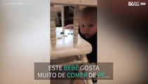 Bebé adora usar cadeira como mesa de jantar!