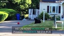 Uma visita inesperada surgiu caminhando e brincando calmamente nesta rua residencial. O urso-negro parecia estar em casa e até