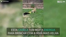 Filhote de cachorro arrasta cão adulto para brincar