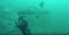Enorme tubarão branco surpreende mergulhador pelas costa e "cumprimenta-o" com a boca