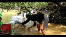 Man Attempts To Break Ice Block Using a Rock But Falls Into Water Instead