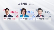 서울시장 현재 개표 94.1% 진행된 가운데 1위는 오세훈 국민의힘 후보입니다. 57.6% 득표율을 차지하고 있습니다. 2위는 박영선 더불어민주당 후보 39.1%입니다. 4위는 여성의당 김진아 후보, 5위 기본소득당 신지혜 후보, 6위는 무소속 신지예 후보가 이어가고 있습니다.