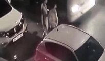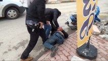 Araç kamerasına yansıyan görüntülerde, motosikletli iki kişi bir kadının çantasını çalıyor.