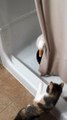 : "Ben the goose just wants a little privacy during bath time, but no goose bath goes unsupervised with a curious cat on the prowl. Ben the goose came to live with us at four days old and immediately became imprinted on me. It was impossible to go anywhere without a tagalong goose. Ben often comes inside for baths when the temperature is too cold, which is more often than not. Ben and Rowena the cat have been 'frenemies' since the start. Ben started out much smaller than Rowena and was an easy target for her antics, but within weeks the goose grew bigger. Rowena didn't seem to notice and is constantly bothering Ben. Ben gives it back and is no victim. The two are definitely playing. This video is only one of many that document the shenanigans these two unlikely playmates get up to."
