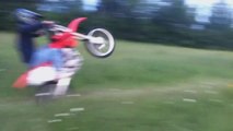 This guy attempted to perform a wheelie for the first time. He rode his dirt bike ahead and tried to do the trick but slipped. This incident caused the guy to fall on his chest with his vehicle on the side.