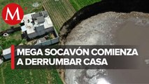 Crece mega socavón en Puebla; comienza a derrumbar casa