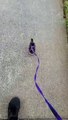 Un homme promène un caneton orphelin en laisse