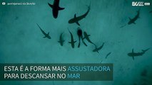 Mergulhador deita no fundo do mar repleto de tubarões