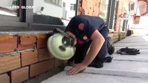Erzincan'ın Yoğurtlu Mahallesi'ndeki caminin dış kaplamasına sıkışan yavru kediyi itfaiye ekipleri kurtardı.