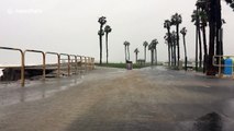 This huge umbrella got dislodged and blew on the shore due to strong winds. This pair was strolling together on the beach ahead. The umbrella accidentally hit the unnoticing people and one of them fell to the ground.