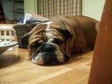The video starts with a snoring pup sleeping on a table, not realizing that the only thing preventing it from crashing on the floor was a "roll-over."