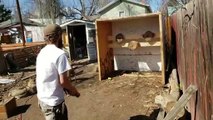 This trick shot champion showed a cool trick with an obelisk-shaped knife. He tossed a can and threw the knife at it. The can ended up sticking on the wooden log in front of him.