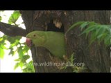 Poking its neck out of its nest-hole in the tree-trunk of a bakain or Persian Lilac tree, this tota surveys the world outside before venturing out, lest it expose its nest location to potential predators or baby bird / pet hunters!
