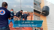 Elementos de Protección Civil de la #CDMX retiraron el tinaco que colgaba de un balcón en un departamento de la alcaldía #Iztacalco.