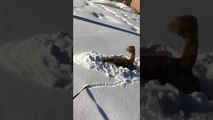 : "I (Lyndsey) was taking my golden retriever, Karma, for a walk around a town called Dawson Creek. She loves snow and often just jumps into it and rolls around or just borrows. I get a kick out of it, so I started videoing her doing what she loves."