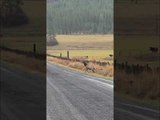 : "A herd of 200 elk in Idaho were crossing between ranches. A cow elk failed to jump high enough to get over the fence and landed in a ditch upside down, shook it off, and headed for the rest of the herd. No animals were harmed in the video."