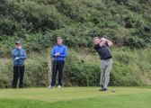 This man attempted to show some trick. He kept a beer can on the ground and placed a golf tee with a ball on top of it. The man hit the ball with a club and ruptured the beer can in the process. He then picked up the can and drank the liquid quickly.