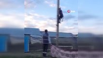 Son dakika gündem haberi... VAN'ın Özalp ilçesinde tırmandığı elektrik direğinde mahsur kalan kedi, itfaiye ekipleri tarafından kurtarıldı.
