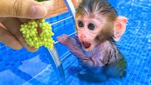 Monkey Baby Bon Bon eats watermelon ice cream and bathes with ducklings in the garden swimming pool
