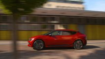 The side profile displays a crossover-inspired silhouette, which is modern, sleek and aerodynamic. A character line runs along the bottom of the doors, curving upwards towards the rear wheel arches to visually elongate the profile of the car. Designed in part to realise ultimate aerodynamic performance, the rear displays a sloping C-pillar with an integrated black glossy insert which appears to extend the window glass. Above this sits a prominent wing-type roof spoiler that channels air downwards towards a raised lower spoiler, which sits atop the car’s unique rear light cluster
