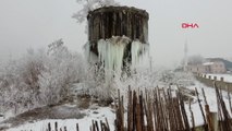 Ağrı'da su deposu buzla kaplandı, araçların üzerine battaniye örtüldü