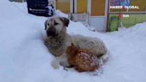 Tunceli’de bir kedi, yoğun kar yağışından korunmak için çareyi köpeğe sığınmakta buldu.