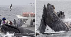 Quatre baleines à bosse chassent un banc de harengs caché sous un bateau de touristes, les images sont magnifiques