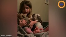 Ce chiot dort dans les bras d’une fillette, bercée par le chant de la petite fille