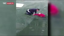 Yaşlı kadını kurtarmak için buzu elleriyle kırdı
