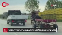 Bursa’da sahibinin elinden kaçan at, arkasına bağlı olan arabasıyla birlikte trafiği birbirine kattı. Araçların arasında ilerleyen sürücüsüz at ve arkasına bağlı olan arabasını sahibinin koşarak yaklamaya çalışması ise diğer sürücülerin kameralarına yansıdı.