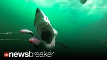 Powerful great white shark filmed breaching the surface from underwater